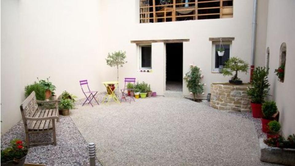 Cour privative végétalisée de 50 m². Jardin non clos commun sur l'arrière.