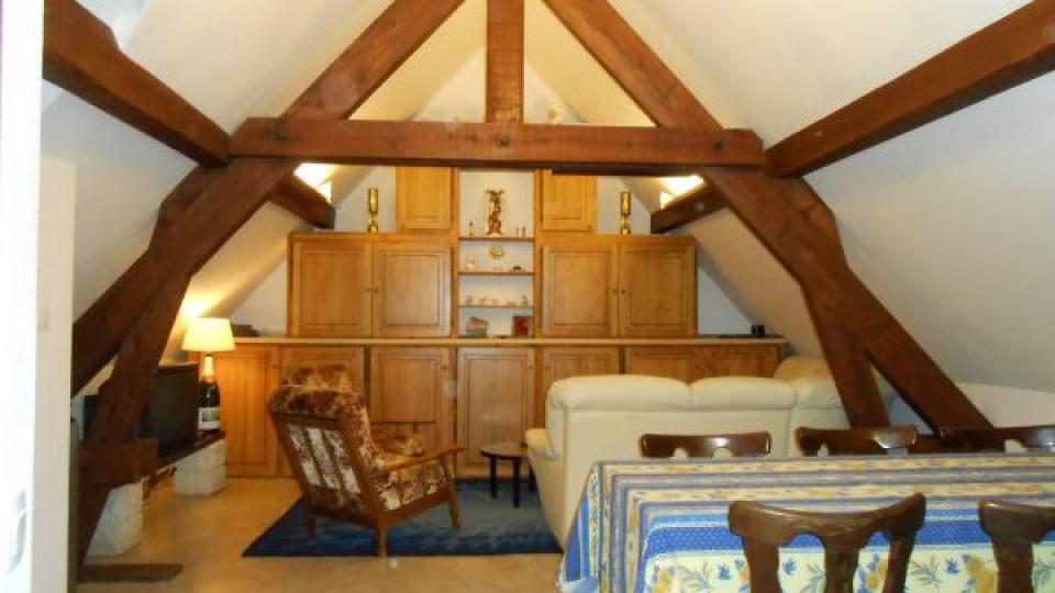 Cuisine équipée (congél.), Salon/séjour avec TV, DVD et climatisation.