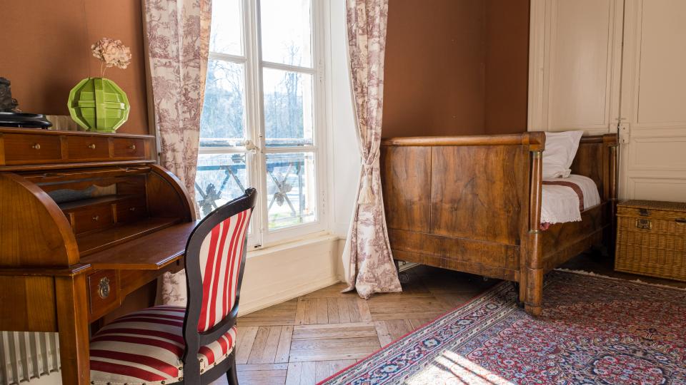 La suite de l’aile Est se situe au rez-de-chaussée de l’aile droite du château et offre un accès direct et une vue magnifique sur le parc. L’appartement est composé de 2 chambres séparées par un agréable dégagement, idéal pour une famille ou des amis qui acceptent de partager les sanitaires.