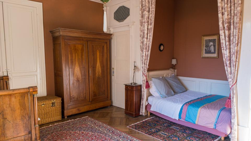 Chaque chambre de la Suite de l’aile Est offre un lit double (140 x 190) en alcôve et donne également sur la terrasse du château. La chambre d’Amélie offre, en plus du lit double, un lit simple (110 x 180). Une troisième chambre à l’étage (la chambre verte) est également disponible sur demande avec un lit double (140 x 200) et un lit simple (90 x 190). L’appartement peut donc accueillir de 2 à 8 personnes selon la configuration choisie.
